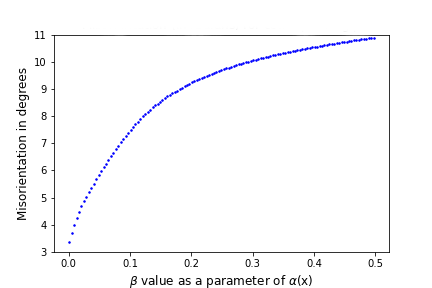 From the figure above, we observe that \(\beta\) is monotone with respect to misorientation. Furthermore, \(\beta\) is an inverse parameter. A small \(\beta\) means higher sensitivity, while a larger \(\beta\) indicates lower sensitivity.