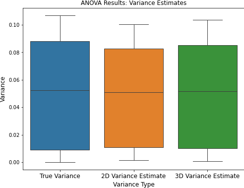 Using a Randomized Complete Block Design for an experiment design, and a two-way ANOVA, we concluded that there was no significant difference between the three groups. This suggests that both the 2D and 3D estimators provide reliable and comparable noise variance estimates in a statistical sense.