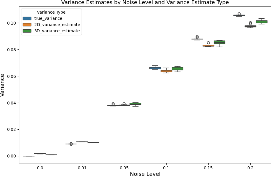 However, as shown in Table 1 and Figure 2, observe that the 3D estimator consistently yields values closer to the true variance across all noise levels. This trend supports the hypothesis that the additional spatial dimension in the 3D estimator improves accuracy (although insignificant in this case).