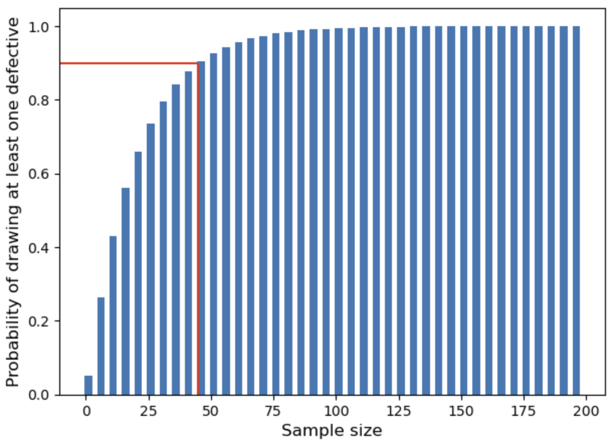 While this reasoning is robust, and quantifies the choice of sample size, we can do better. When can we guarantee the detection of a defective item if one exists? What about the probabilities? can we have more control over the level of confidence we desire to achieve?