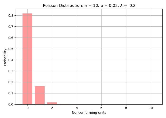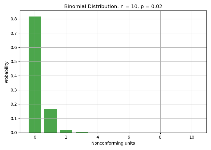 Suppose a process has a nonconforming rate of \(p = 0.02\) (2%). We take a sample of size \(n = 10\), and we want the probability of finding zero nonconforming units in the sample.