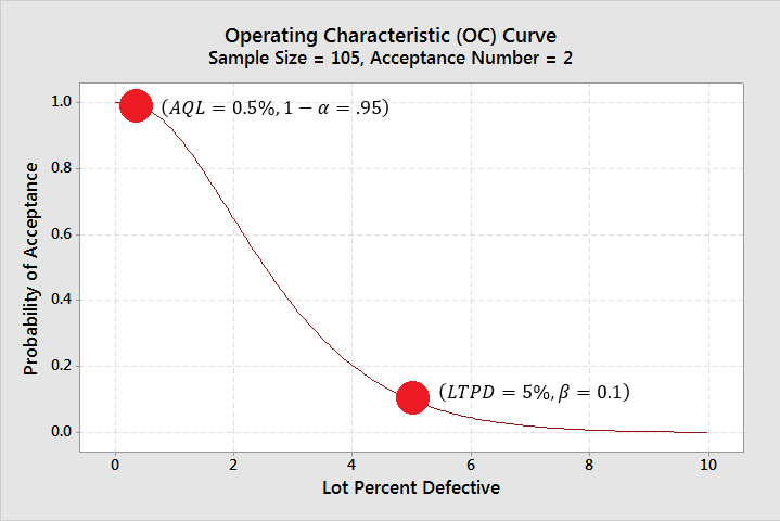 In every sampling plan, the lot size, \(N\), the sample size, \(n\), and the number of conforming units \(c\), are the most important. If you sample \(n\) units from of a lot of \(N\) and only pass the lot if you find no more than \(c\) defective units: