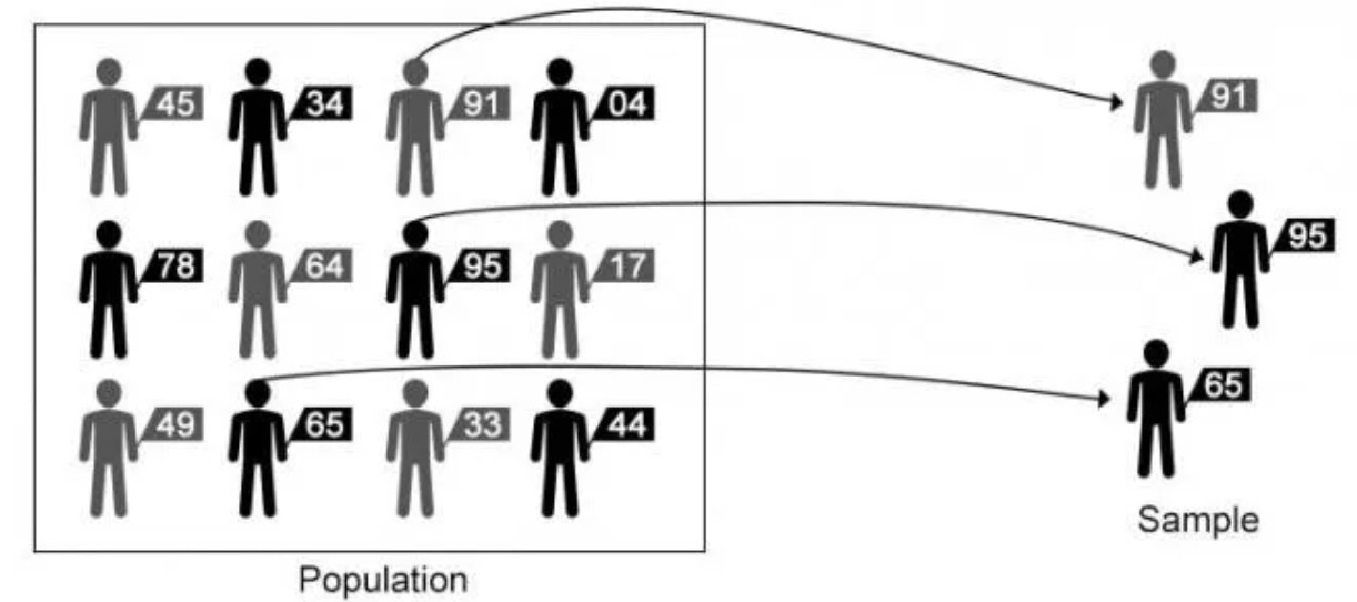 Each element may be assigned a random number, and then using a random number generator, we may select a sample from the population based on the random numbers generated. The random number may be selected using any probability distribution function, although a uniform distribution is the most common choice.
